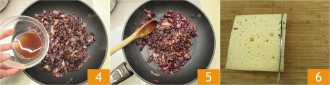 Ahora, añade el vinagre de frambuesa 4, mezcla y apaga el fuego 5. Deja que se temple. Mientras tanto, ocúpate del queso Asiago DOP fresco. Córtalo en rodajas de 1 cm de grosor 6.