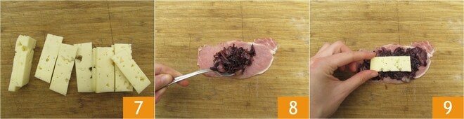 Luego ajusta los trozos de manera que puedan quedar en el centro de las lonchas de lomo 7. Coloca en una tabla la primera loncha de lomo, coloca encima un poco de radicchio 8 y un trozo de Asiago DOP fresco 9.
