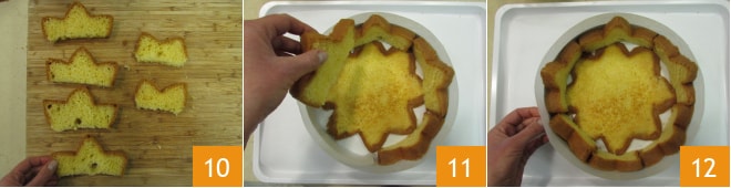 Con las rebanadas no tostadas crea las puntas de la corona. Así que obtén en total 4 piezas con 3 7 puntas y 2 piezas con 2 puntas 8, si es necesario puedes recortarlas aún más según el molde y el grosor de las rebanadas 9.