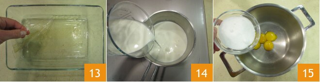 Mientras tanto, dedícate a la crema. Sumerge la gelatina en agua fría, debería absorberla completamente 13, y mientras se ablanda vierte la nata y la leche en un cazo 14 y lleva a ebullición. En otro cazo vierte las yemas con el azúcar 15,