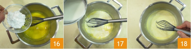 comienza a mezclar y luego añade la maicena 16. Vierte en hilo la nata y la leche ya muy calientes 17 para obtener una mezcla lisa 18.