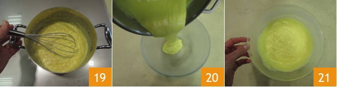 Lleva la olla al fuego. Cocina mezclando continuamente con un batidor hasta que tengas una crema lisa 19. Luego transfiérelo a un bol que habrás dejado enfriar en el congelador 20 y mezcla unos instantes para bajar la temperatura de la crema 21.