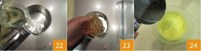 Mientras tanto, pon un cazo al fuego y calienta el cava 22, luego recupera la gelatina, viértela en el cava y disuélvela con el fuego apagado 23. Añádelo a la crema 24.
