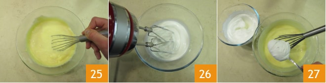 Mezcla y deja templar unos minutos 25. Mientras tanto, vierte la nata en un bol, móntala sin llegar a la clásica consistencia de nieve firme sino más suave 26 y agrégala a la crema mezclando delicadamente 27.