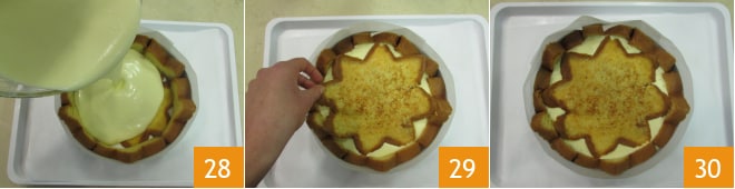Vierte la crema en el cascarón de pandoro 28, coloca la última rebanada de pandoro tostada (si fuese necesario corta las puntas con una forma un poco más pequeña que el molde) 29, colócala sobre la crema presionando ligeramente para compactar. Deja que se endurezca en la nevera por al menos 4 horas 30.