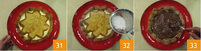 Recupera la tarta y transfiérela a un plato de servir 31. Espolvorea solo las puntas con azúcar glas 32. Luego unta Nutella® sobre toda la superficie 33,