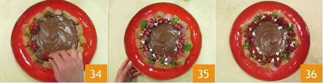 y adorna con grosellas 34, frambuesas y turrón desmenuzado 35. Completa con algunas hojitas de menta y ¡tu corona de pandoro con Nutella® está lista 36!