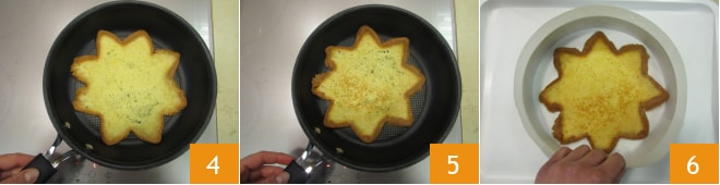 y luego tuéstalas en una sartén antiadherente por unos instantes 4, hasta que estén completamente doradas por ambos lados 5. La primera rebanada tostada colócala en el fondo de un plato en el que ya habrás dispuesto un anillo de repostería de 22 cm y forrado con papel de horno 6.