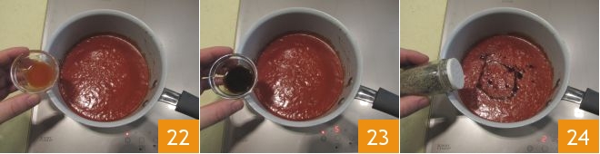 Añadid también el tabasco 22, la salsa worcester 23, la sal y la pimienta 24