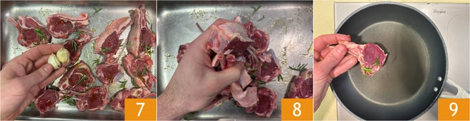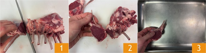 Para preparar las chuletas de cordero a la sartén, lo primero que debes hacer es extraer las chuletas del costillar de cordero cortando la carne entre un hueso y otro 1 2. Traslada las chuletas a una bandeja 3.