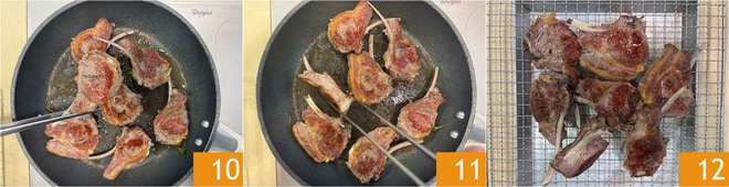 Dora a fuego medio-alto durante 4 minutos por un lado y 6 minutos por el otro 10. Si es necesario, gira las chuletas también la parte del hueso para eliminar el color rojizo 11. Cuando estén bien doradas, traslada las chuletas a una rejilla 12 y déjalas reposar durante unos minutos.