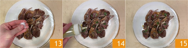 Sírvelas y completa con sal de Maldon 13, algunas hojas de mejorana y un hilo de aceite 14 en crudo. ¡Las chuletas de cordero a la sartén están listas para ser servidas 15!