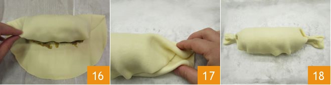 Ahora cierra los dos bordes de la masa sobre el cotechino para envolverlo 16. Dobla los extremos 17 para sellar bien el rollo como un caramelo 18.