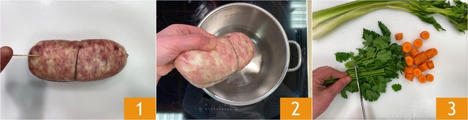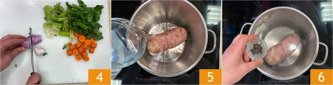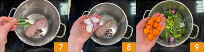 Agregad las hojas de salvia 7, el chalote 8, el apio, el perejil y las zanahorias 9.