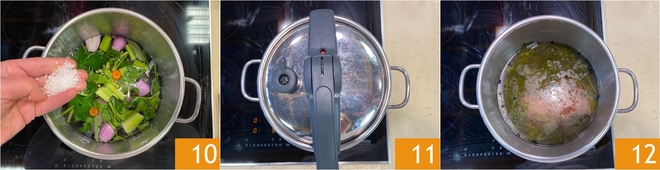 Añadid la sal 10 y cerrad la olla con su tapa 11. Encended a fuego medio y, cuando empiece a silbar, bajad la llama y dejad cocinar durante 35 minutos. Transcurrido este tiempo, apagad el fuego y levantad la válvula para que salga el vapor; cuando ya no esté bajo presión podréis abrir la tapa 12.