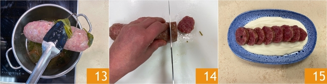 Extraed el cotechino del agua 13 y colocadlo sobre una tabla de cortar. Eliminad el posible cordel 14 y cortadlo en rodajas. ¡Servid vuestro cotechino en olla a presión acompañado de lentejas o puré 15!