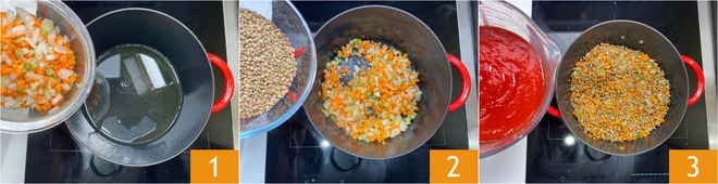 Para preparar el cotechino y lentejas con salsa, prepara un picado de zanahorias, apio y cebollas. En una cacerola vierte un buen chorro de aceite y el picado 1, sofríe a fuego lento removiendo de vez en cuando. Luego añade las lentejas tras enjuagarlas 2. Mezcla, deja que tomen sabor unos instantes, y luego vierte la salsa de tomate 3.