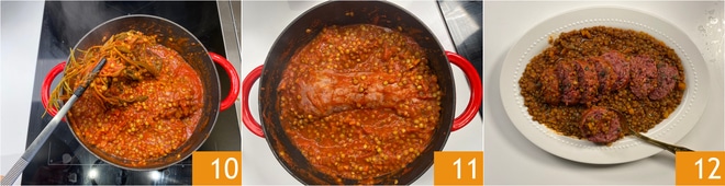 Deja cocinar con tapa, unos 30 minutos más, a fuego muy bajo. De vez en cuando revisa y remueve con cuidado. Cuando la cocción esté terminada, quita el ramillete de hierbas aromáticas 11. Saca el cotechino, córtalo en rebanadas y sírvelo con las lentejas 12, sazonadas con un chorro de aceite y un picado de salvia y romero.