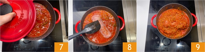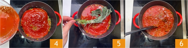 Añade el agua (puedes verterla en el recipiente de la salsa de tomate para "enjuagarlo") 4, luego añade al guiso el ramillete de hierbas aromáticas (salvia y romero), sal y pimienta al gusto 5. Mezcla 6.
