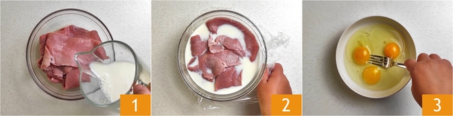 Para preparar las chuletas al horno, lo primero que deben hacer es colocar los filetes de carne en un bol grande y verter la leche por encima 1. Cubran con film transparente 2 y dejen reposar en el frigorífico durante 30 minutos. Mientras tanto, rompan los huevos en un plato, añadan sal y bátanlos con un tenedor 3.