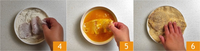 Pasado el tiempo de marinado, escurran los filetes de carne de la leche y pásenlos por harina 4, sacudiéndolos suavemente para eliminar el exceso. Después, sumérjanlos en los huevos batidos 5 y finalmente cúbranlos con pan rallado 6.