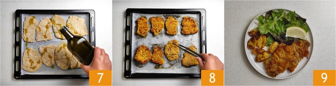 Coloquen los filetes en una bandeja forrada con papel de horno, ajusten de sal y rocíen ambos lados con aceite 7. Cocinen en horno estático precalentado a 200° durante 30 minutos, en la rejilla del medio, dando vuelta a las chuletas a mitad de cocción 8. ¡Sus chuletas al horno están listas para ser servidas, tal vez acompañadas con ensalada, una rodaja de limón y patatas al horno 9!