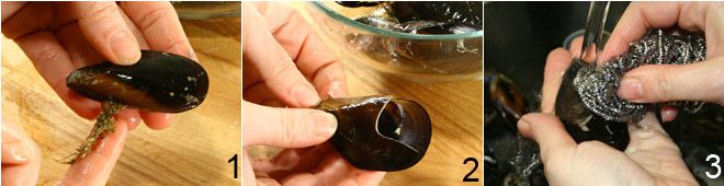 Arranca de cada mejillón la barba (biso)1 que sobresale de la concha, descarta las que estén rotas 2 y limpia bien la concha de los restantes cepillándola (o ráscala con un estropajo de acero nuevo)3, luego lávalos bajo el agua corriente y después escúrrelos.
