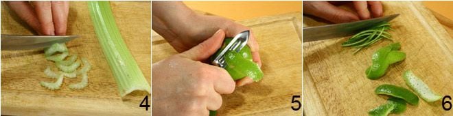 Lava, elimina los filamentos y corta el apio en rodajas 4, dándole un grosor de ½ cm; lava la lima (o un limón), sécala y, con un pelador de patatas, retira la cáscara 5 evitando recoger también la parte blanca (que puede resultar amarga); corta en tiras finas 6 las partes de cáscara retiradas.