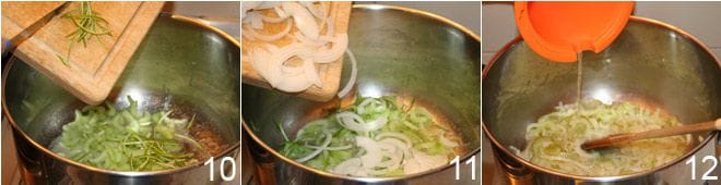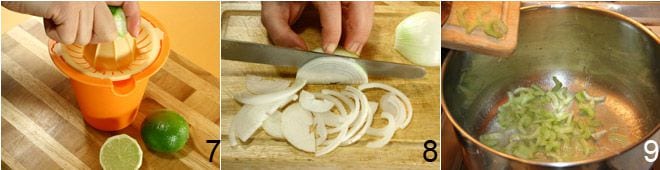 Exprime la lima 7 y guarda el jugo aparte. Pela y corta la cebolla por la mitad, luego corta las 2 partes en rodajas de un grosor de 2-3 mm 8. En una olla grande derrite la mantequilla y luego añade el apio, 9 las cáscaras de lima 10 y la cebolla 11;