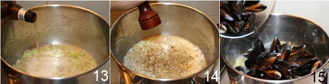 Cocina los ingredientes durante unos minutos y luego añade la pimienta molida 14 y los mejillones 15. Mezcla bien los ingredientes y cocina todo a fuego alto hasta que los mariscos se hayan abierto completamente, luego apaga el fuego y sirve inmediatamente, acompañando el plato con patatas fritas cortadas en bastones.