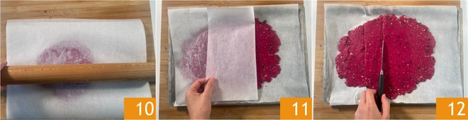 Con el rodillo, extendéd la masa entre las dos hojas de papel de horno 10. Obtened un grosor de unos 1,5 mm 11 y luego con un cuchillo formad vuestros crackers, del tamaño preferido 12. ¡Los de los bordes serán más irregulares pero igual de buenos!