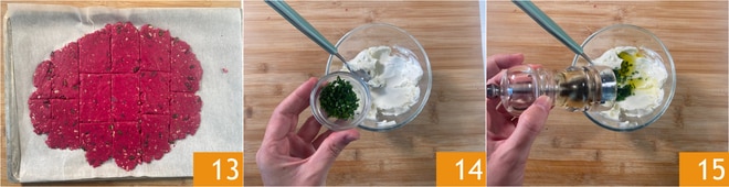 Mezclad para obtener una crema homogénea 16. Sacad del horno vuestros crackers de remolacha y dejad que se enfríen, luego disfrutadlos con la crema de queso 18.