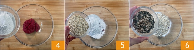 Verted el puré en un bol y añadid la harina de arroz 4, los copos de avena 5, las semillas 6 y la sal.