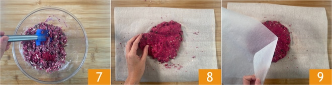 Mezclad para amalgamar 7. Continuad luego en la superficie de trabajo amasando a mano para obtener una masa consistente. Tenderá a desmoronarse ligeramente, trasladadla sobre una hoja de papel de horno 8, colocad encima otra hoja 9.