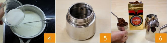 Agregad a la leche la cantidad restante de azúcar 4 y el almidón de maíz (o la fécula de patata) y comenzad a calentarla a fuego lento, removiendo para disolver el azúcar y el almidón de maíz. Luego, preparad el café con la moka: poned el agua fría, preferentemente con bajo contenido de cal, dentro de la caldera hasta la válvula de seguridad 5 (de lo contrario obtendréis un café más largo). Llenad el filtro con el café molido 6.