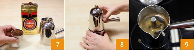 Nivelad cada cucharadita de café añadida golpeando el filtro sobre la mesa con movimientos firmes 7, hasta llegar al borde del filtro. No presionéis con la cucharita, ni hagáis agujeros y enroscáis bien la cafetera 8 (para evitar que el café se salga por los lados mientras sube), luego colocadla a fuego bajo y constante, para obtener un café corpulento. A medida que el café suba, se formará una espuma densa 9; recomendamos no dejar hervir el café demasiado tiempo para mantener intacto su aroma y dulzura.