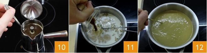 Luego apagad el fuego y el café que usaréis en la preparación está listo: mezcladlo directamente en la moka con una cucharita, para hacerlo más homogéneo 10. Agregad a la leche las bayas de cardamomo machacadas y el café 11, mezclad 12 y cocinad a fuego lento hasta que la mezcla hierva.