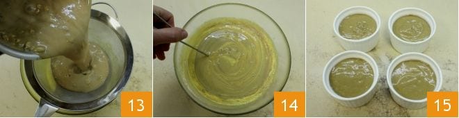 Cuando la crema se haya espesado y esté hirviendo a fuego lento, apagad el fuego y vertedla filtrándola con un colador sobre los huevos batidos con el azúcar 13. Mezclad las preparaciones 14, luego volvedlas a poner en la cacerola y al fuego durante un par de minutos siempre removiendo. Luego llenad 4 cocottes de 160 ml cada una con la crema obtenida 15 y colocadlas en el frigorífico durante al menos 2 horas.