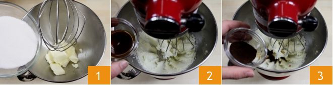Para empezar, haced las cucharitas de pasta frolla de café que acompañarán la crema catalana de café y cardamomo: en una batidora (o en un bol grande) poned la mantequilla en trozos ablandada, añadid el azúcar 1 y empezad a batir hasta obtener una mezcla espumosa. Luego añadid el café líquido 2 y el café en polvo 3 y mezclad bien con las varillas.