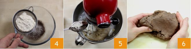 En un bol aparte, verted el cacao en polvo y la harina tamizada 4. Mezclad y verted la mezcla junto con los otros ingredientes en la batidora (o en un bol grande usando una batidora eléctrica) 5, mezclad nuevamente con las varillas y luego continuad amasando con el gancho plano. (Si no tenéis el gancho plano de la batidora, podéis terminar de amasar directamente con las manos sobre una superficie de trabajo). Transferid la masa a la superficie de trabajo y amasad con las manos hasta obtener una masa homogénea y manejable 6.