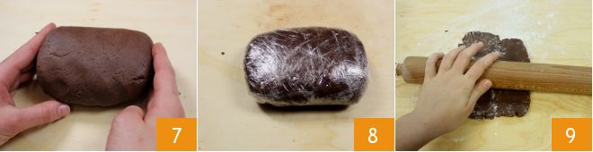 Formad un bloque 7 y cubridlo con film transparente 8. Ponedlo en el frigorífico a reposar durante al menos 2 horas. Pasado el tiempo necesario, extendid la masa sobre una superficie ligeramente enharinada 9 hasta obtener un grosor de aproximadamente medio cm.