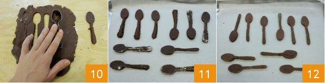 Luego obtén 15 cucharitas 10, amasando y extendiendo nuevamente la masa hasta terminarla. Poned las cucharitas de café en una bandeja cubierta con papel de horno 11 y horneadlas en el horno estático precalentado a 170° durante unos 20 minutos. Pasado el tiempo necesario, sacadlas del horno 12 y dejadlas enfriar un poco antes de servirlas junto con la crema catalana.
