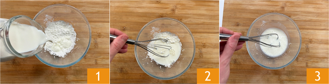 Para preparar la crema catalana, lo primero que debes hacer es poner el almidón de maíz en un bol pequeño, añadir una pequeña parte de los 500 g de leche 1 y mezclar con una varilla 2 hasta disolverlo completamente 3.