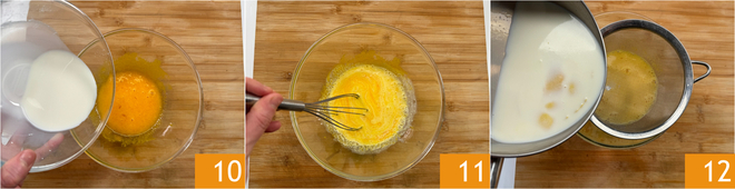 Añade el almidón de maíz disuelto en la leche 10 y mezcla nuevamente con una varilla 11. Cuando la leche haya llegado al punto de ebullición, retírala del fuego y cuélala a través de un colador directamente dentro del bol con la mezcla de huevos 12.