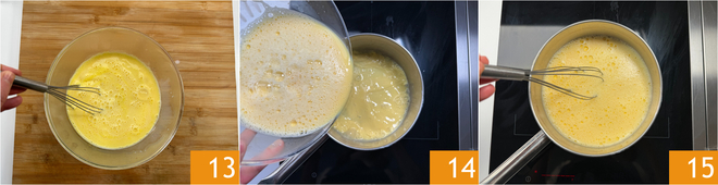 Mezcla siempre con una varilla 13. Transfiere la mezcla nuevamente al cazo 14 y cocina a fuego lento, removiendo continuamente 15, hasta que la crema se haya espesado.