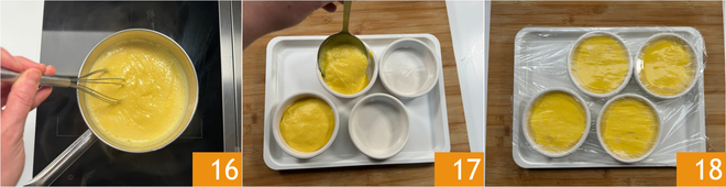 Debes obtener una textura lisa y cremosa 15. Transfiere la crema obtenida dentro de 4 cocottes de 11 cm de diámetro, de aproximadamente 2 cm de altura 16 17, nivela con cuidado la superficie con el dorso de una cuchara y cubre con film plástico. Deja enfriar en el frigorífico durante al menos 2 horas 18.