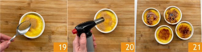 Al momento de servirlas, retoma las cocottes, espolvorea el azúcar moreno sobre toda la superficie 19 y pasa el soplete por encima para permitir que el azúcar se caramelice 20. Cuando se haya formado la típica costra, tu crema catalana está lista para ser servida 21.