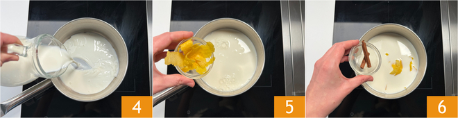 Vierte la parte restante de la leche en un cazo 4, aromatiza con la cáscara de un limón 5 y la rama de canela 6.