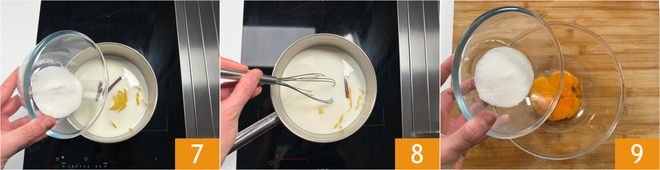 Añade 50 g de azúcar tomados de la dosis total 7. Mezcla con una varilla 8 y calienta hasta que esté a punto de hervir. Mientras tanto, en otro bol, mezcla las yemas con los restantes 50 g de azúcar 9 batiendo con una varilla.