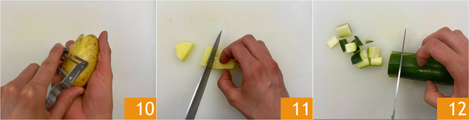 Pela las patatas 10 y córtalas primero en rodajas y luego en cubos de aproximadamente 1 cm 11. Corta los extremos de los calabacines y córtalos primero en rodajas y luego en cubos 12.